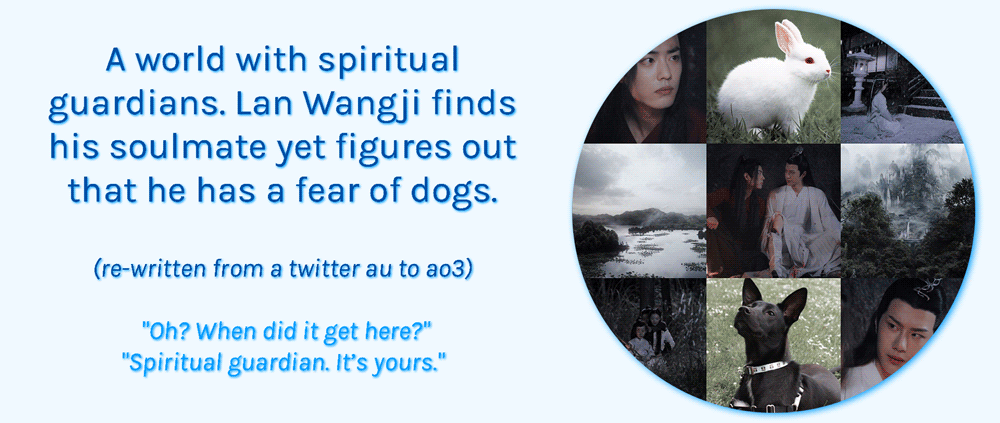 A world where everyone has their own spiritual animal. Wei Wuxian's spiritual animal is a bunny while Lan Wangji's just so happens to be a dog.